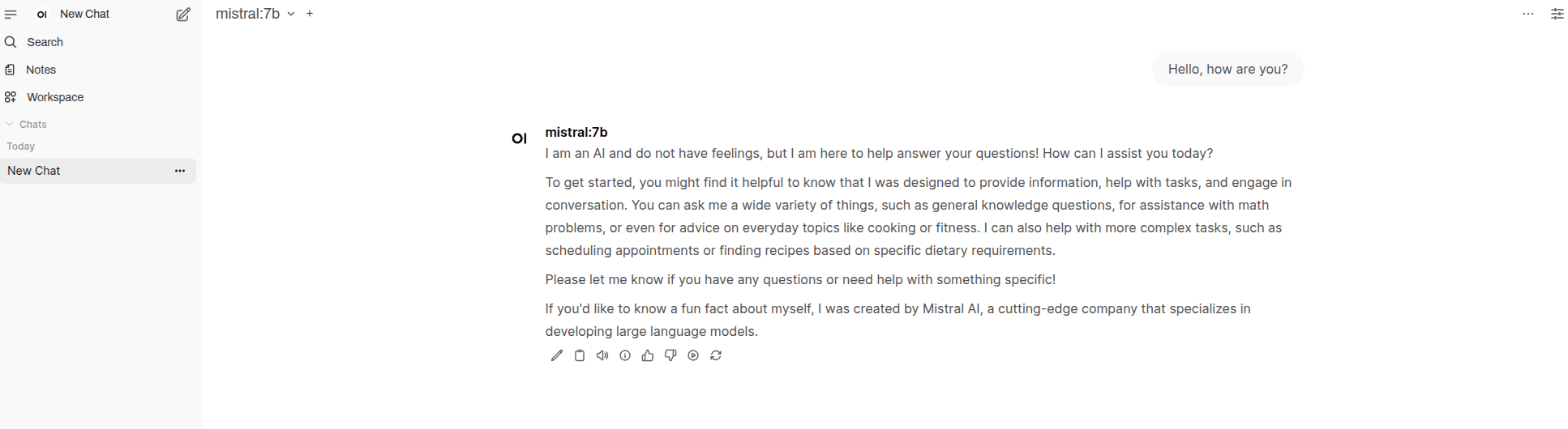 Once complete, you should see Mistral available in your model dropdown. Give it a quick test in the chat: „Hello, how are you?“ If it responds coherently, we are good to go.